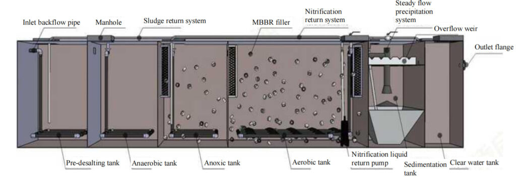 MBBR integrated sewage treatment equipment is an advanced moving bed biofilm reactor (MBBR for short) process, an efficient sewage treatment equipment independently developed by the company through innovation. The principle of the MBBR process is to increase the biomass and biological species in the reactor by adding a certain amount of suspended carriers, thereby improving the treatment efficiency of the reactor. Since the filler density is close to that of water, it is in a state of complete mixing with water during aeration. The environment for microbial growth is three-phase: gas, liquid and solid. The collision and shearing action of the carrier in water makes the bubbles smaller, thus improving the utilization rate of oxygen. In addition, there are different biological species inside and outside each carrier. Anaerobic or facultative bacteria grow inside, and aerobic bacteria grow outside, so that nitrification and denitrification exist simultaneously, thus improving the treatment effect.